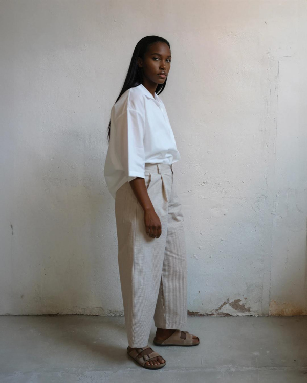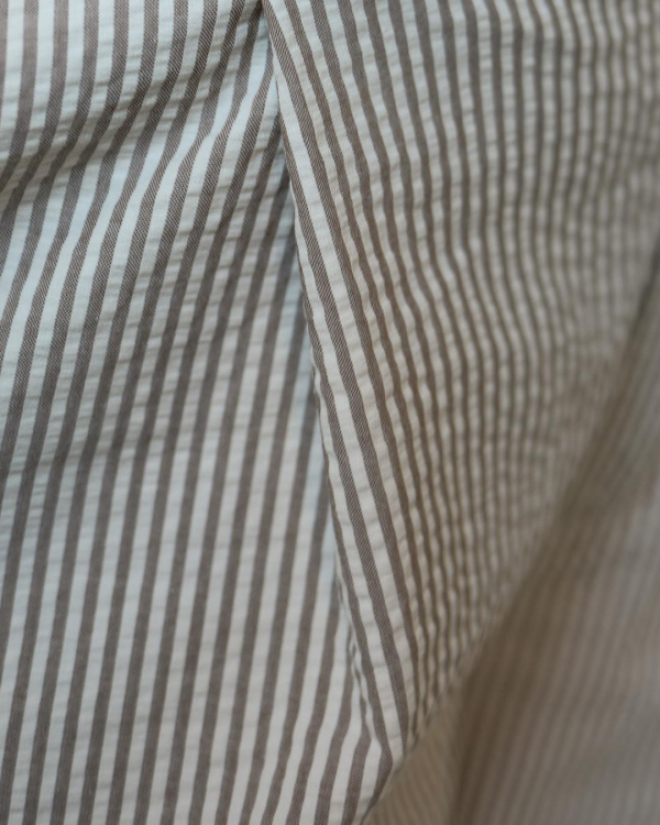 Seersucker 100% cotton trousers in ecru and caramel stripes. Mid-rise with elastic at the back for a perfect fit. Patch pockets at the back and front pockets. Fly with wooden button closure. Made in Spain