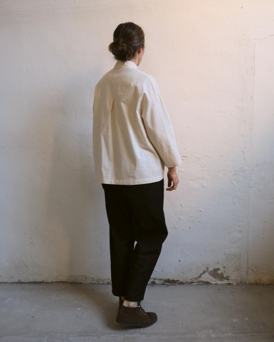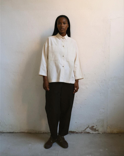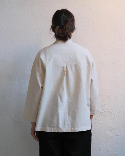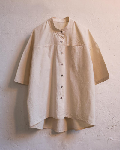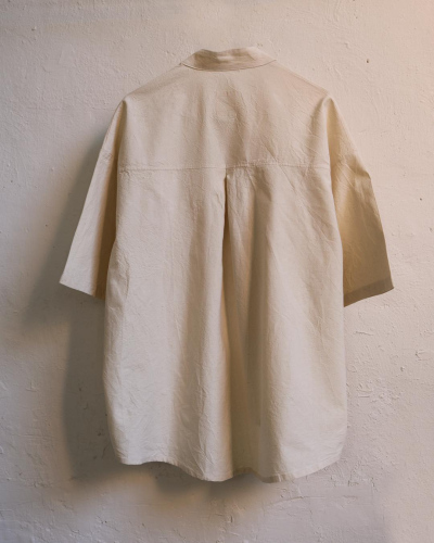 100% washed raw cotton. Banded collar. Two front seam pockets. Featuring mother of pearl buttons. Made in Spain. Length: 63 cm (back 71cm) Waist contour: 110 cm Arm length (from the middle back to the end of the sleeve): 51 cm