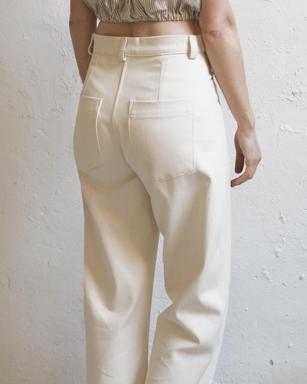 High-waisted 100% raw cotton pants. Featuring long wide legs. Two front pockets and two back pockets. Button closure. Inspired by beach days in Paradise Cove, CA. Made in Spain