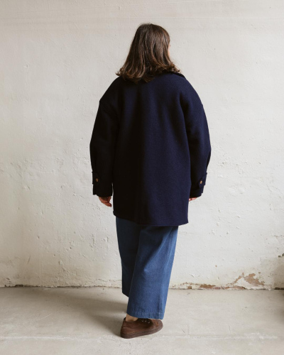 100% boiled wool coat. 100% raw cotton lining. Mother of pearl buttons closure. Featuring two large front pockets. Timeless elegance for perfection. Made in Spain