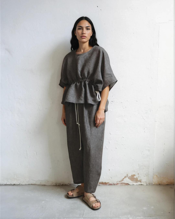 High-waisted trousers made from natural fabric (50% cotton 50% linen). Featuring two front pockets and back patch pockets. Elastic waistband. Full front pleats. Button front closure. Made in Spain