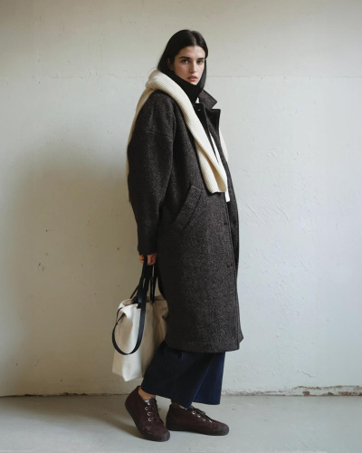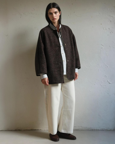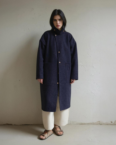 100% boiled wool coat. 100% raw cotton lining. Mother of pearl buttons closure. Featuring two large front pockets. Timeless elegance for perfection. Made in Spain