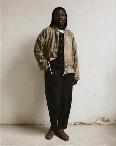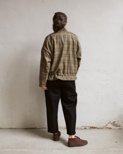 Exquisite plaid 100% merino wool and 100% organic cotton fleece lining. Includes two seam pockets. Adjustable with a cotton drawstring for a classic bomber jacket style. Mother-of-pearl buttons. Made in Spain.