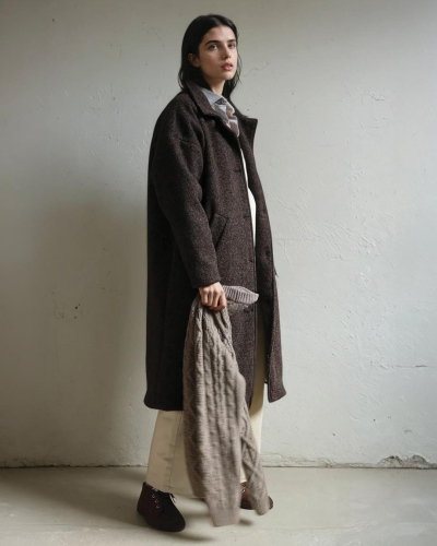 Timeless double-layered long coat made from 100% boiled wool. Front opening with wooden button closure. Two front pockets. Classic elegance with a contemporary design and raw edges. Featuring neck closure for adjustment. Made in Spain