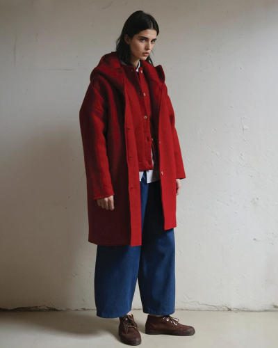 Double-layered hood coat made from 100% boiled wool. Front opening with wooden buttonclosure. Two front pockets. Classic elegance with a contemporary design and raw edges. A versatile piece, perfect for any occasion. Made in Spain