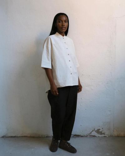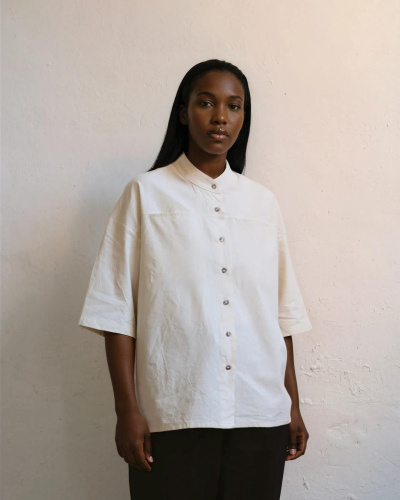 100% washed raw cotton. Banded collar. Two front seam pockets. Featuring mother of pearl buttons. Made in Spain. Length: 63 cm (back 71cm) Waist contour: 110 cm Arm length (from the middle back to the end of the sleeve): 51 cm