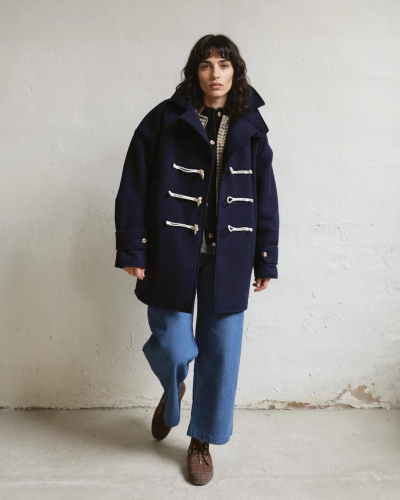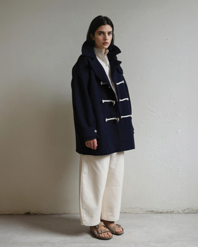 Classic double-layered duffle coat made from 100% boiled wool. Front opening with wooden button and cotton cord closure. Two front side pockets. Classic elegance with a contemporary design and raw edges. A versatile piece, perfect for any occasion. Made in Spain