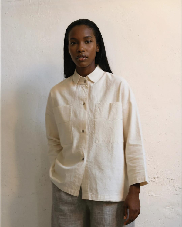 100% washed raw cotton. Featuring two front pockets. Mother of pearl buttons. Made in Spain