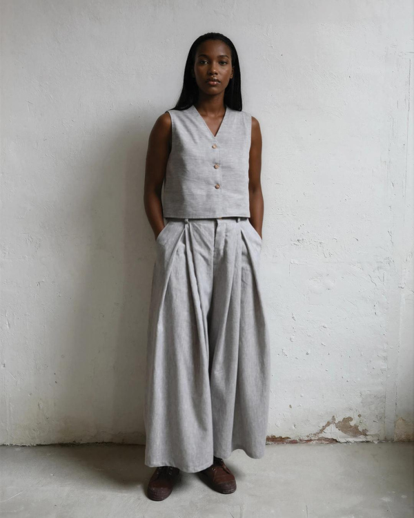 High-waisted trousers made from natural fabric (50% cotton 50% linen). Featuring two front pockets and back patch pockets. Elastic waistband. Full front pleats. Button front closure. Made in Spain