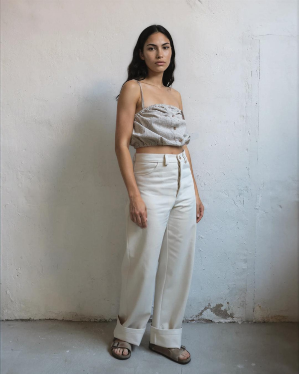 High-waisted 100% raw cotton pants. Featuring long wide legs. Two front pockets and two back pockets. Button closure. Inspired by beach days in Paradise Cove, CA. Made in Spain